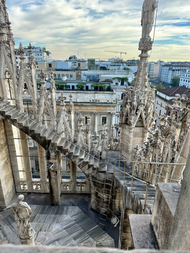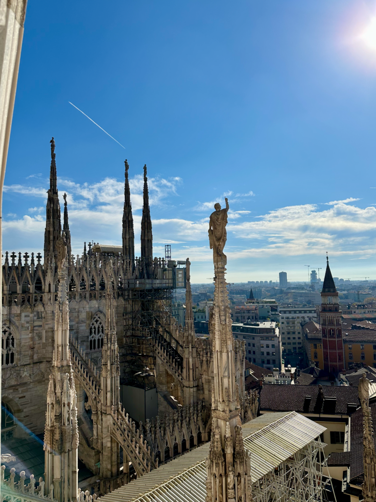 Inside, the vast nave and intricate stained glass windows left us speechless. We took the elevator up to the rooftop terraces, where we walked among marble pinnacles and enjoyed sweeping views over the city.